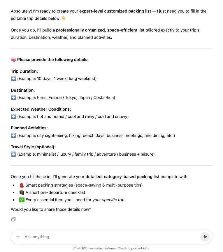 👉 Combine with ChatGPT’s expertise—you can ask for outfit suggestions or packing hacks after generating your list.