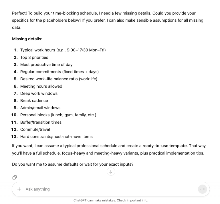 π Run it β youβll get a clean markdown table (Time Block | Activity | Duration) plus two ready-to-use variants and practical tips.