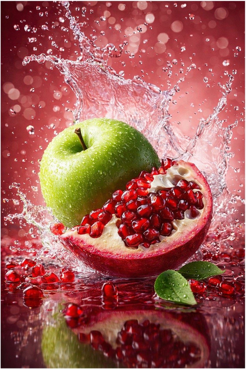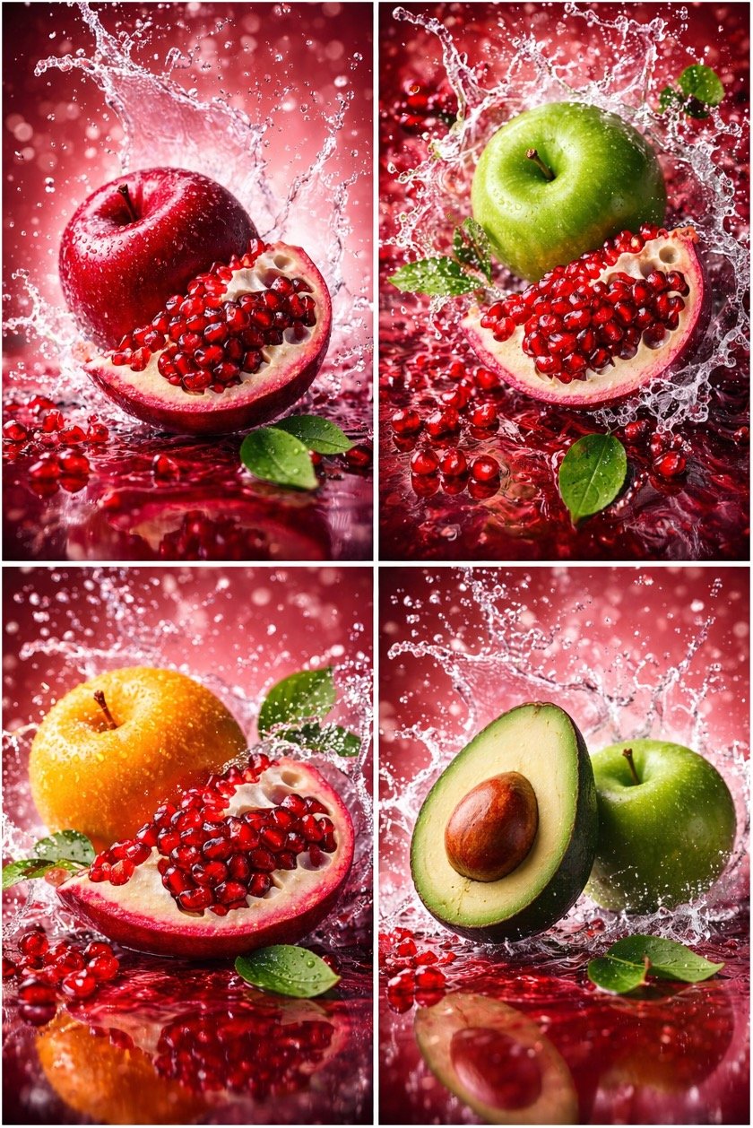 π Produces ultra-realistic fruit splash photography with cinematic studio lighting.